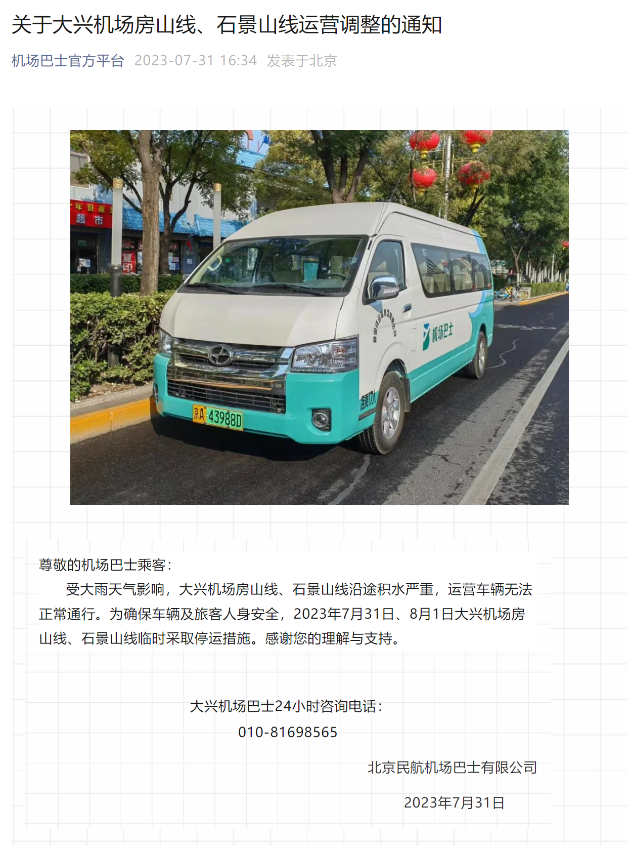 受大雨天气影响,大兴机场房山线、石景山线沿途积水严重,运营车辆无法正常通行。为确保车辆及旅客人身安全,2023年7月31日、8月1日大兴机场房山线、石景山线临时采取停运措施。感谢您的理解与支持。