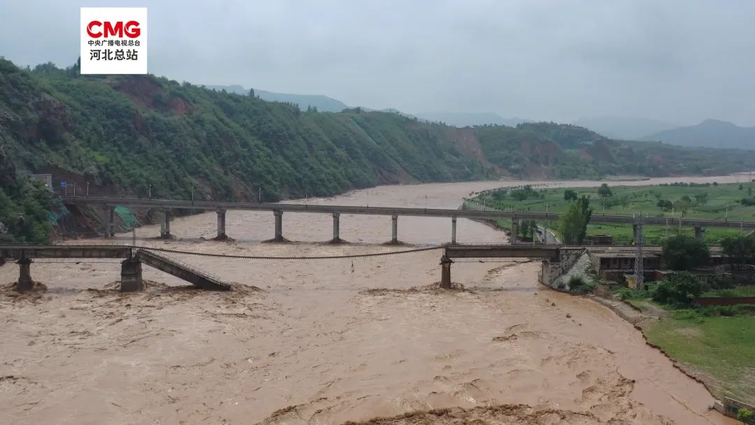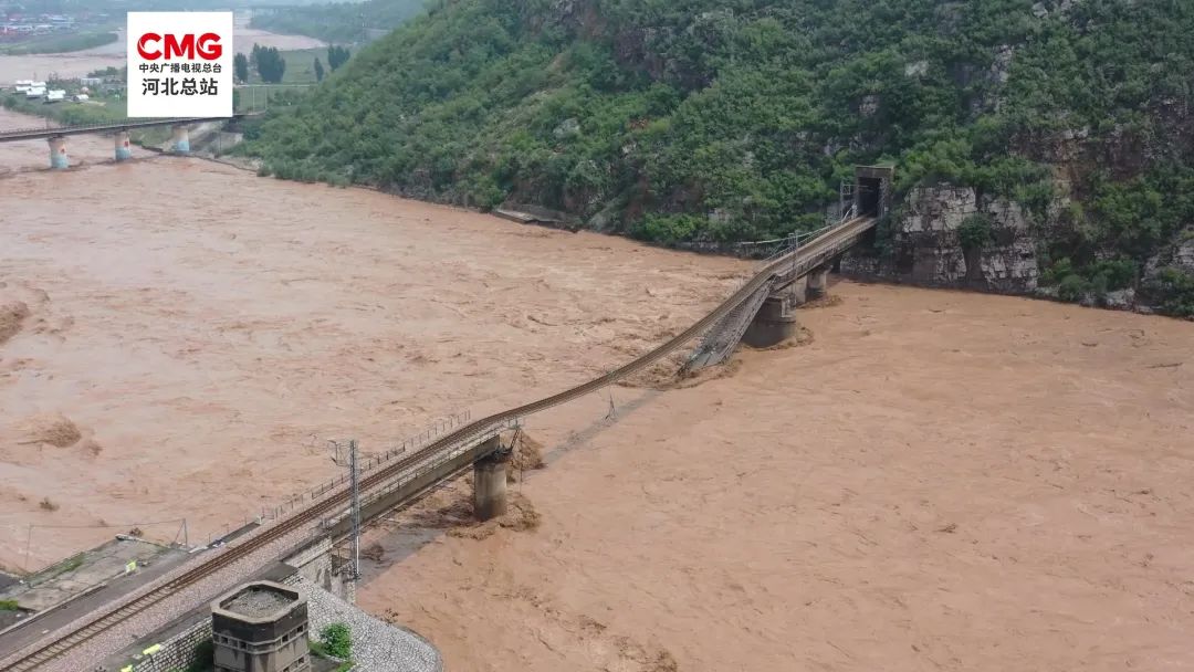 航拍石家庄井陉境内的石太铁路秀林段被洪水冲断坍塌现场。中央广播电视总台河北总站图