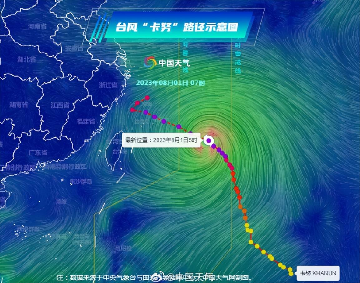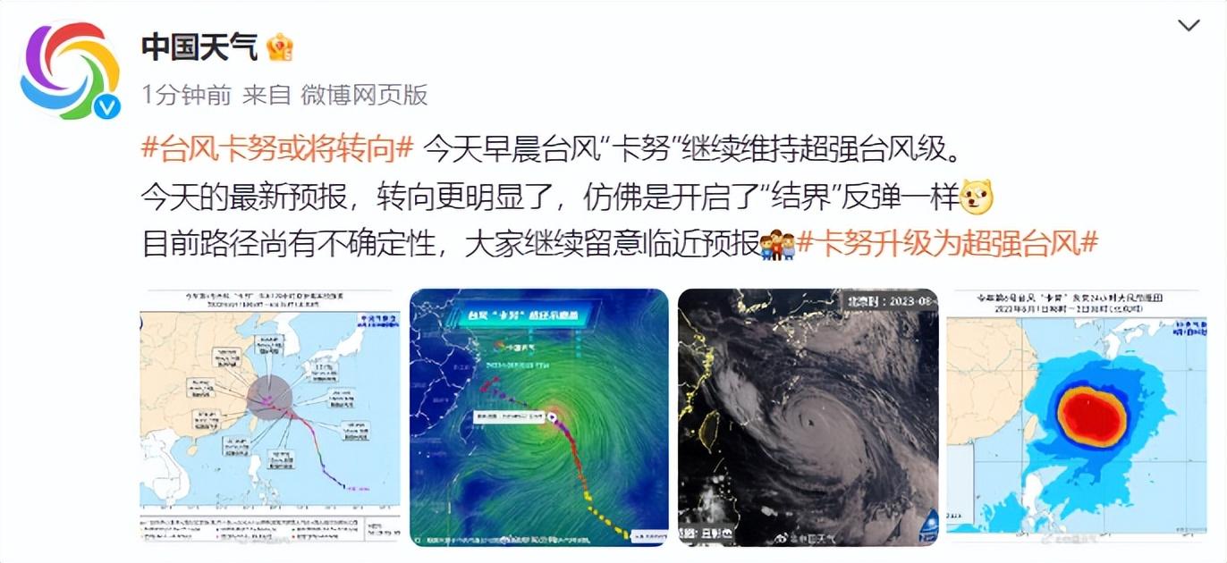 今天(8月1日)早晨台风“卡努”继续维持超强台风级,据@中国天气 称,今天的最新预报,转向更明显了。目前路径尚有不确定性,大家继续留意临近预报。