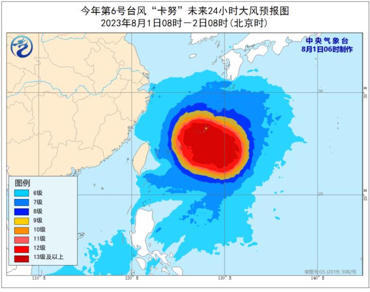 大风预报:8月1日08时至2日08时,东海大部及钓鱼岛附近海域、台湾以东洋面、巴士海峡以及浙江东部沿海、台湾岛北部沿海将有6-8级、阵风9-10级的大风,其中东海东南部海域风力可达9-12级、阵风11-14级,“卡努”中心经过的附近海面的风力有13-16级、阵风17级及以上。