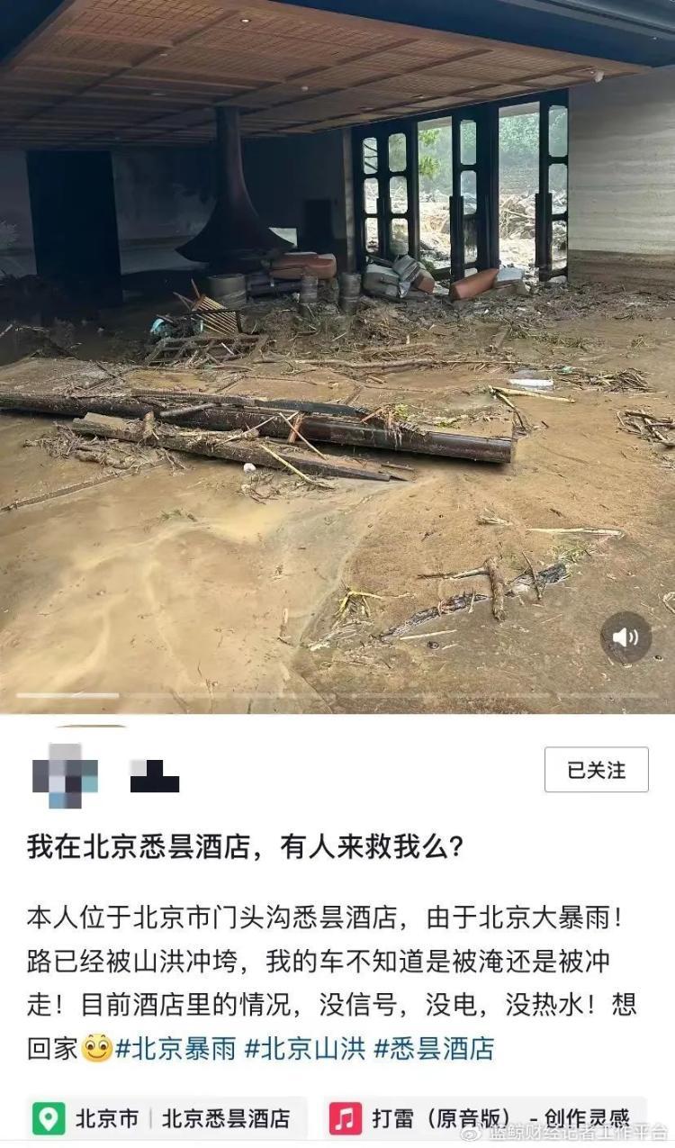 事件发酵在7月31日晚间,一位北京悉昙酒店的住客在社交平台上发布求救信息。据悉,该酒店位于京西门头沟阳坡元老村旧址,与千年古刹潭柘寺相距仅千米。其系国际顶尖酒店联盟“罗莱夏朵”成员,也是业内人士眼中的标杆性项目。目前,该酒店大堂受洪水冲击,大堂外部分景观水毁较为严重。