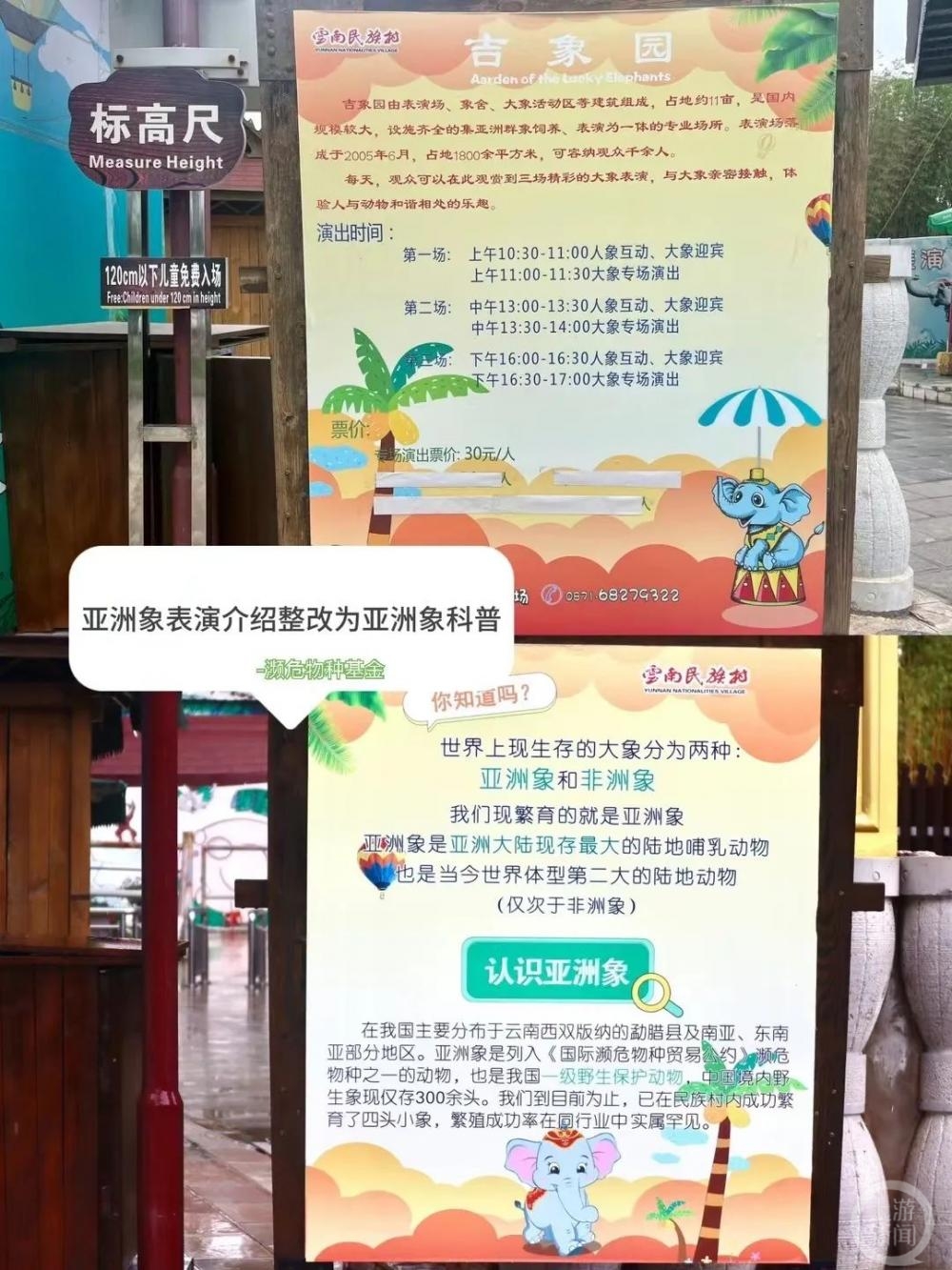 31日下午,上游新闻记者以游客身份致电云南民族村景区客服。工作人员称,景区内大象表演场确已取消大象表演和骑乘体验等项目,时间大概在7月初,“具体需咨询吉象公司,他们是管理大象的。”