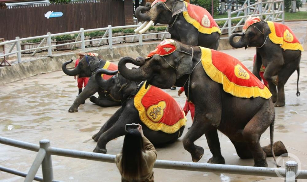 据媒体报道,游客拍摄的视频中,大象们不再摇头晃脑地跳舞、驼人、转呼啦圈,而是用象鼻灵活地拿起小小的花生,用脚踩碎椰子和西瓜,把果实塞进嘴里,或是扬起鼻子,喷出一道水花……