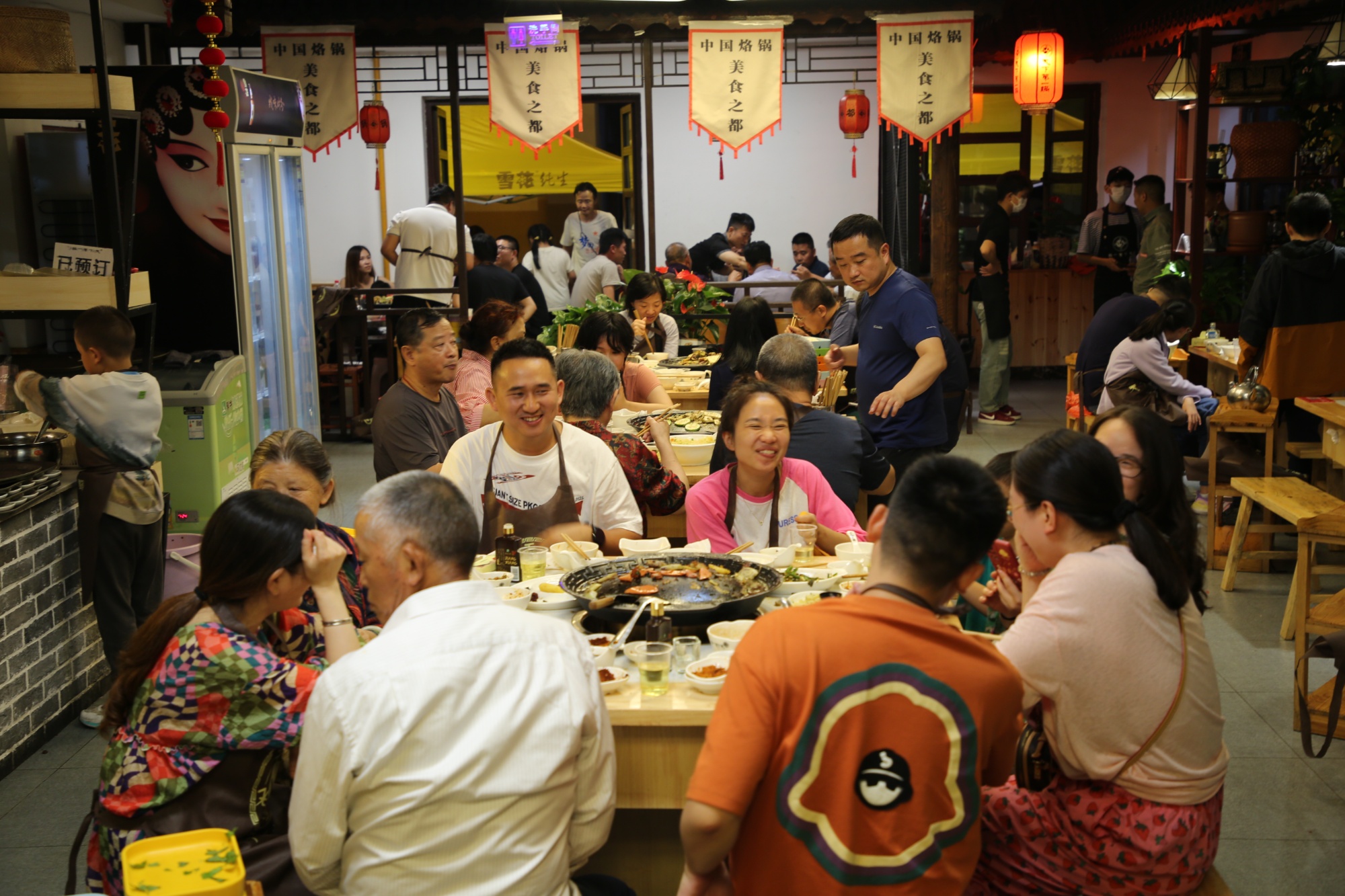 游客在六盘水市水城古镇“天下第一锅”饮食城品尝水城烙锅(赵桦摄)