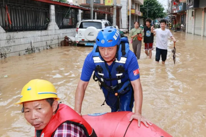7月29日,陈元生已经为“杜苏芮”备勤4天。当天下午5点35分,他和队友傅积达的橡皮艇来来回回,已经转移受困群众共22人。下水推船、水中传递食物、搀扶涉水老人,陈元生尽力把每一位受灾群众送到安全地带。