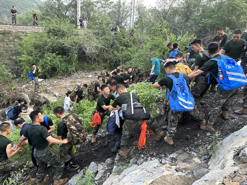2023年8月2日,武警北京总队机动第三支队官兵徒步进山帮助滞留旅客转运。