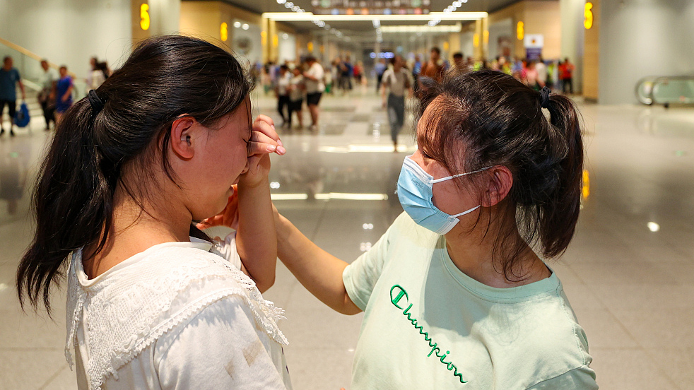 2023年8月2日,因强降雨被困北京门头沟K396次列车旅客抵达北京丰台站。刘媛女士(右)在出站口迎接滞留的亲人。