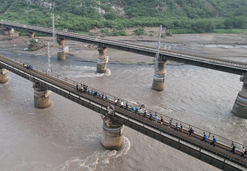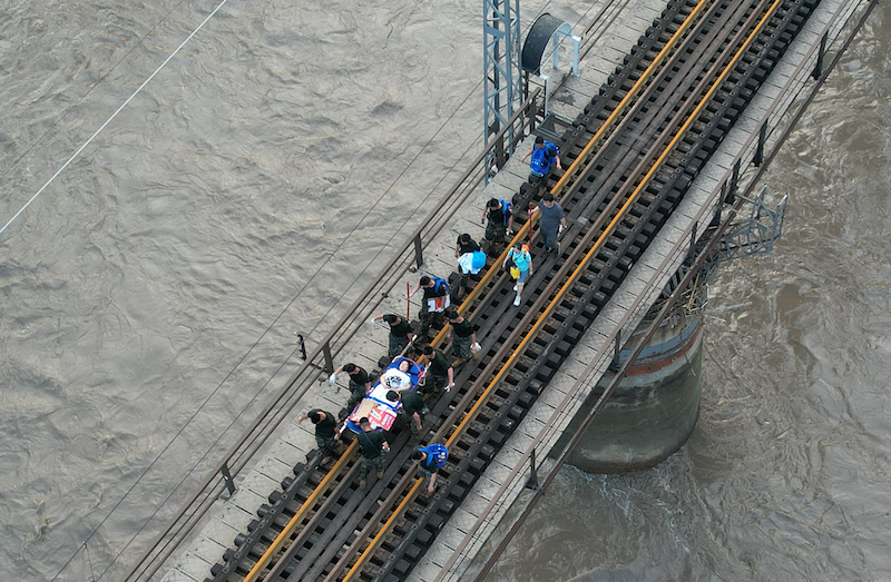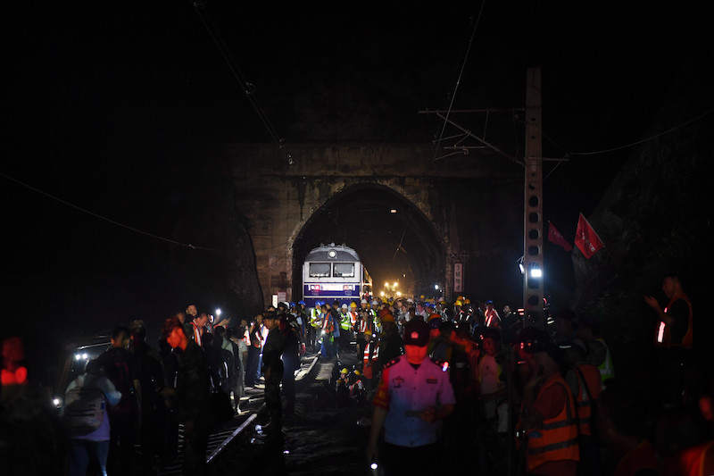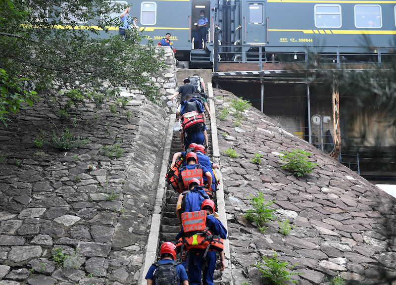 2023年8月2日,受困列车旅客在救援人员帮助下赶往转运客车。