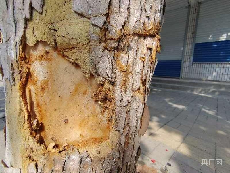 事故现场,路旁树的树皮已经掉落(央广网记者刘博伦摄)