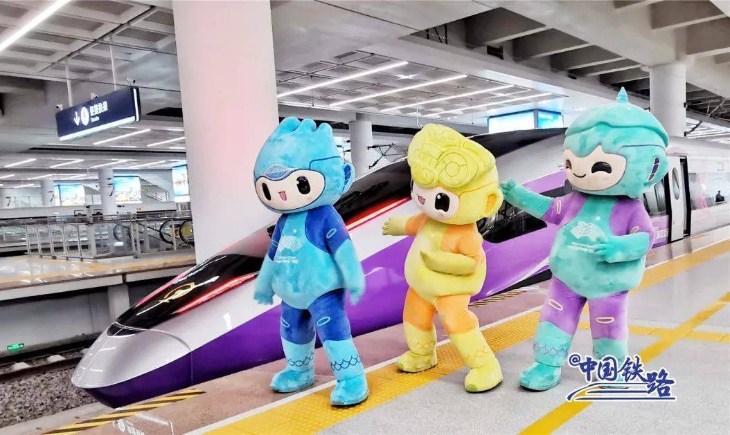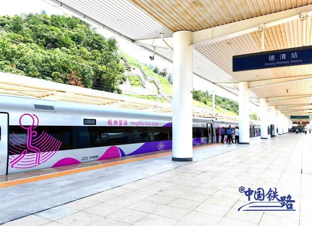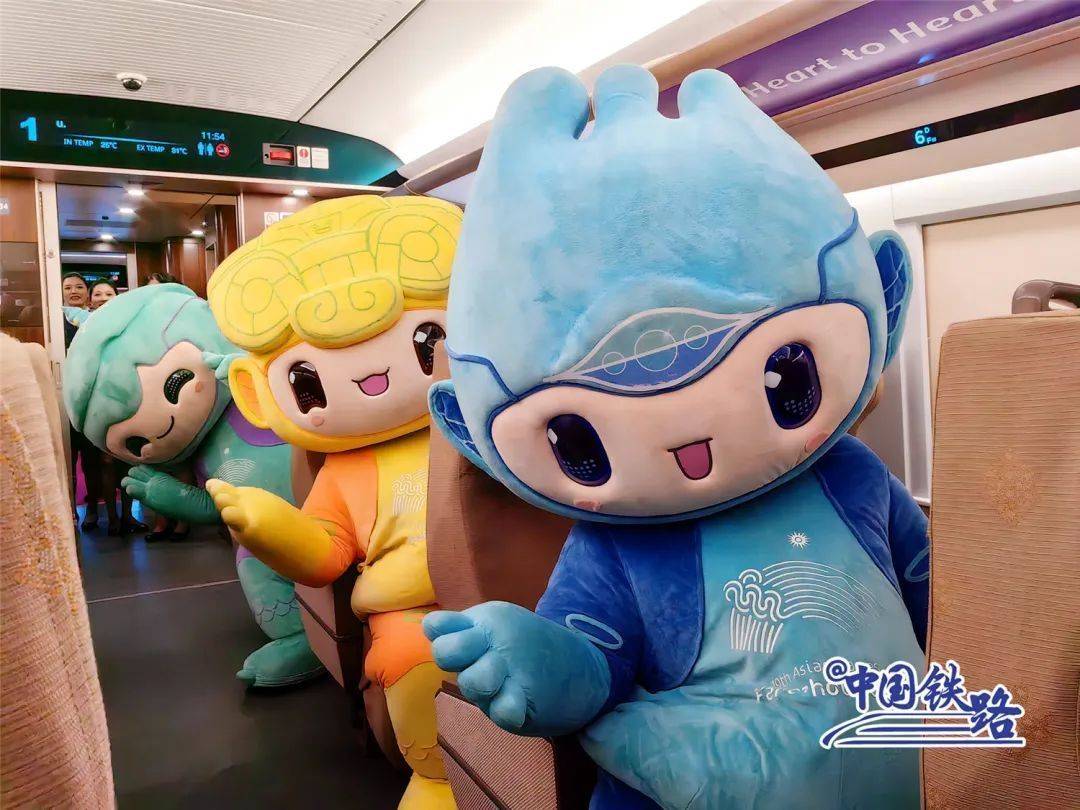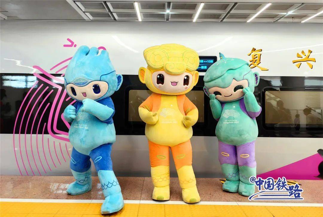 今天,亚运会吉祥物组合“江南忆”也随车打卡,吸引众人目光。列车经停德清站、杭州西站、桐庐东站期间,不少体验者下车与吉祥物合影,气氛轻松热烈。