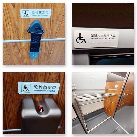 便于残疾人出行的4号无障碍车厢拥有更宽阔的过道,各处盲文可以引导、提示旅客找到座位。这里还专门设置了轮椅存放区和大件行李存放区。