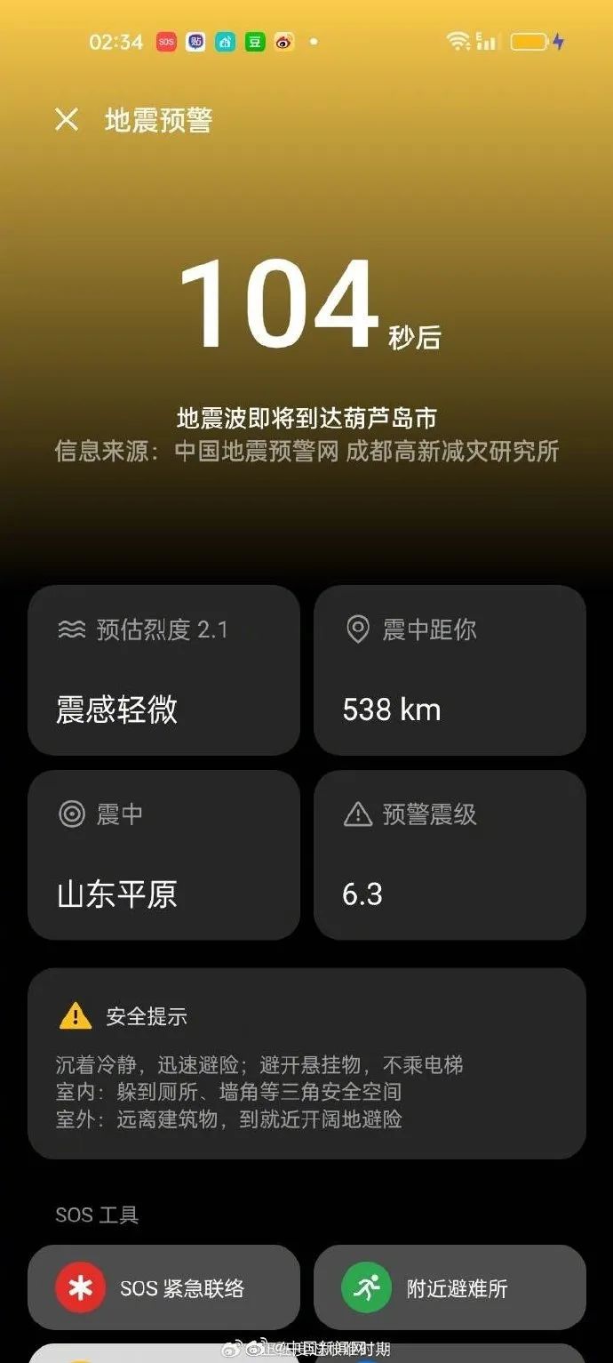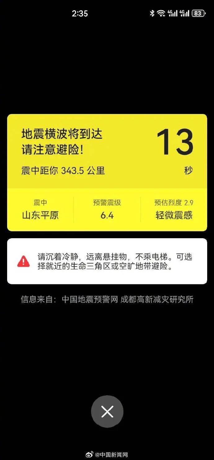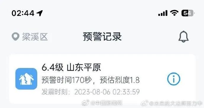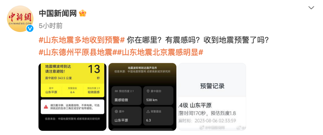 中国地震台网正式测定:8月6日2时33分在山东省德州市平原县(北纬37.16度,东经116.34度)发生5.5级地震,震源深度10千米。据中国地震台网正式测定,8月6日3时2分在山东德州市平原县发生3.0级地震,震源深度9千米。据中国地震台网消息,截至8月6日6时,共记录到余震56次,其中3.0级及以上余震1次:5.0-5.9级地震0次,4.0-4.9级地震0次,3.0-3.9级地震1次;3.0级以下余震55次:2.0-2.9级地震3次,1.0-1.9级地震34次,1.0级以下地震18次。多地网友收到地震预警——