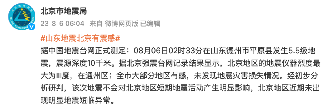 8月6日5时10分,山东省抗震救灾指挥部指挥长、副省长周立伟在省应急指挥中心组织召开省抗震救灾指挥部会议,进一步调度相关情况,安排部署下一步工作。要求加强组织领导,全面排查受灾情况,全力搜救受灾人员,加大经费物资保障和维护稳定工作。@北京市地震局 研判:据北京强震台网记录结果显示,北京地区的地震仪器烈度最大为III度,在通州区;全市大部分地区有感,未发现地震灾害损失情况。经初步分析研判,该次地震不会对北京地区短期地震活动产生明显影响,北京地区近期未出现明显地震短临异常。据@北京铁路,受山东省德州市平原县发生5.5级地震影响,为确保列车运行安全,国铁北京局已启动一级应急响应,对管内京沪高铁、京沪线、京九线、石济客专、石德线运行列车采取扣停措施,正在组织对相关线路设备进行全面检查,途经列车将出现停运或不同程度晚点。具体列车运行信息请关注相关站车公告。截至发稿,8月6日北京南站始发G103次、G171次、G2551次、G1083次、G45次、G1次、G173次、G201次、G105次、G2553次、G107次、G1099次、G1061次、G887次、G109次、G177次、G31次、G3次、G203次、G197次、G111次、G179次、G2555次、G113次、G1085次、G261次、G321次、G33次;天津西站始发G441次;沧州西站始发G3681/4次列车停运。8月6日途经石济客专(石家庄至济南)的D1661次、D1621次、G375次、D1611次、G2074/5次、G2070/1次、D1601次、D1634/1次、G2815次、D1650/47次、D1623次、D2780/77次、D1666/3次、D1670/67次、D1654/1次、G1864/1次、G3683/2次、D1642/39次、D1676/7次、D1638/5次、D1603次、D1615次、G2056/7次、D1672/3次、G377次、G379次、G2096/3次、D1625次、G2088/9次、D1646/3次、G1832/29次列车停运。