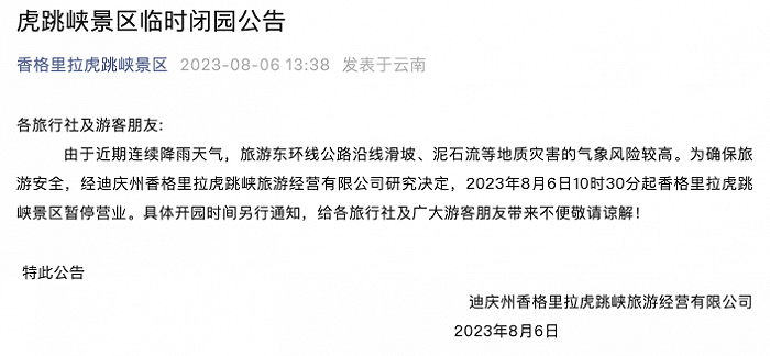 由于近期连续降雨天气,旅游东环线公路沿线滑坡、泥石流等地质灾害的气象风险较高。为确保旅游安全,经迪庆州香格里拉虎跳峡旅游经营有限公司研究决定,2023年8月6日10时30分起香格里拉虎跳峡景区暂停营业。具体开园时间另行通知,给各旅行社及广大游客朋友带来不便敬请谅解!特此公告