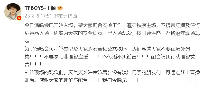 刚刚,组合官博及@TFBOYS-王俊凯 @TFBOYS-王源 @TFBOYS-易烊千玺 发文呼吁大家配合安检工作,遵守秩序进场,不携带灯牌及任何危险品入场,遵守现场规定;恳请大家不要在场外聚集,不要参与非理智应援,不传播不实谣言。