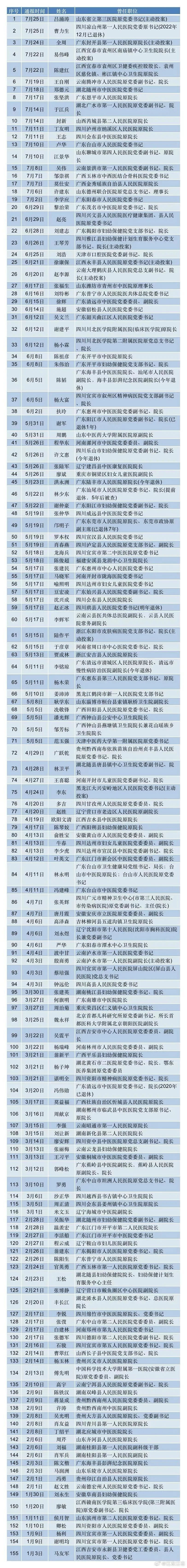 根据塞柏蓝的不完全统计,今年至今,全国已有至少155位医院院长、书记被查,数量已超过去年全年的两倍。除了“落马”的院长、书记之外,被查的科室主任更是众多。
