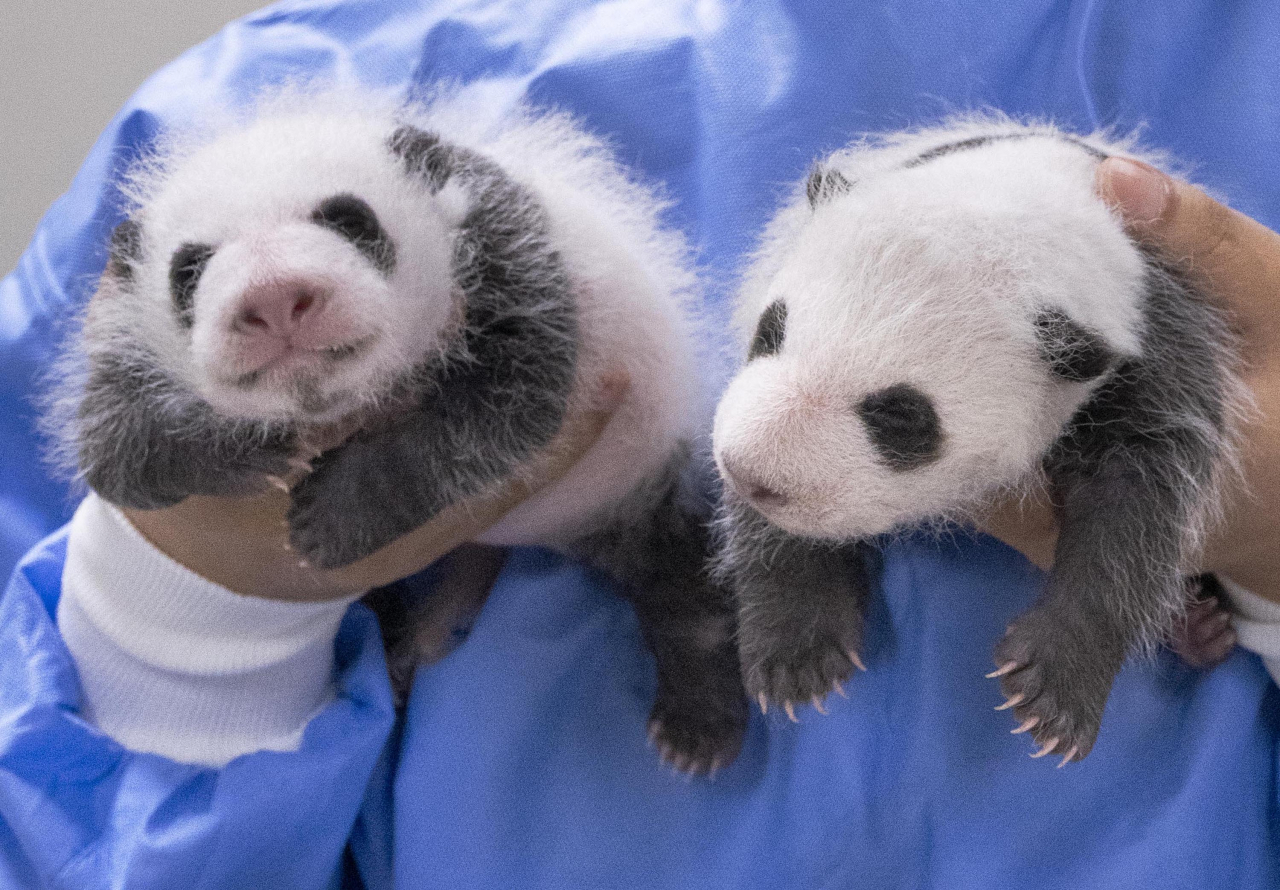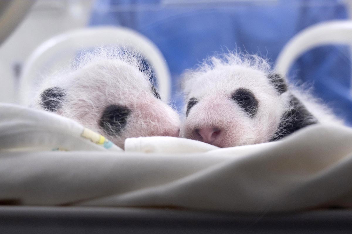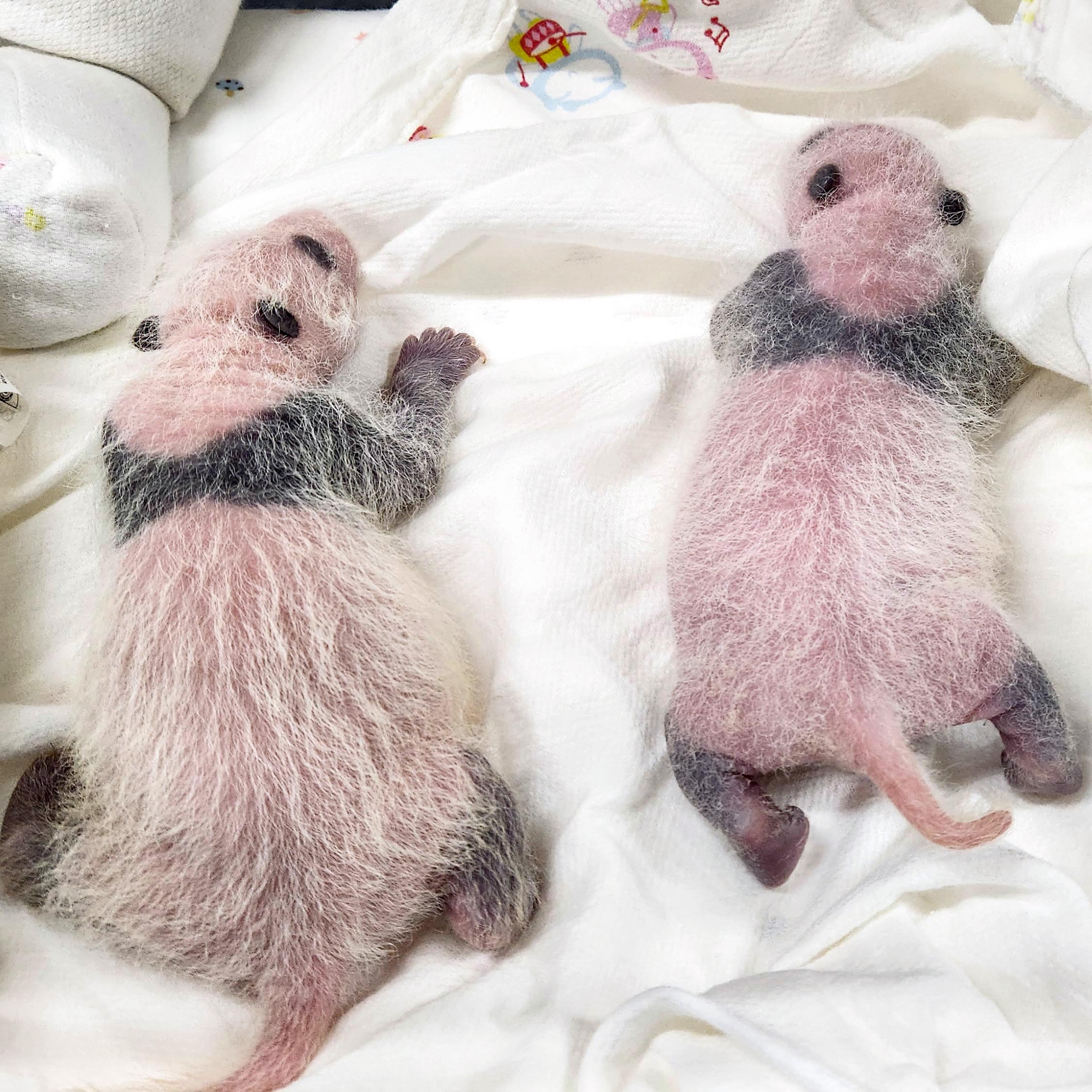 双胞胎宝宝出生20天了。它们的肤色颜色变得越来越深,都像戴上了“墨镜”,穿上了“背带裤”,越来越有熊猫样了,身上的白色绒毛也长长长密不少。