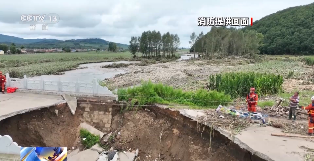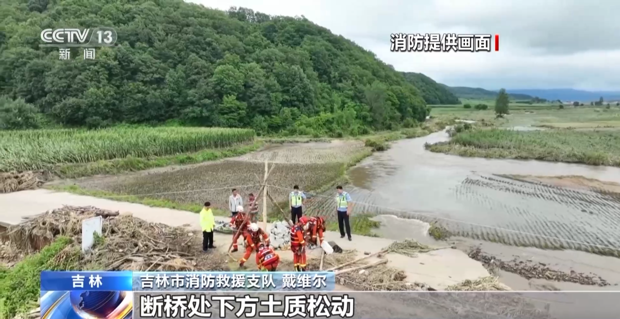 吉林市消防救援支队 戴维尔:断桥处下方土质松动,存在二次坍塌的危险,唯一能与对岸相连的地方还是由被洪水冲倒的树木和泥土形成的狭窄通道,无法满足救援条件,