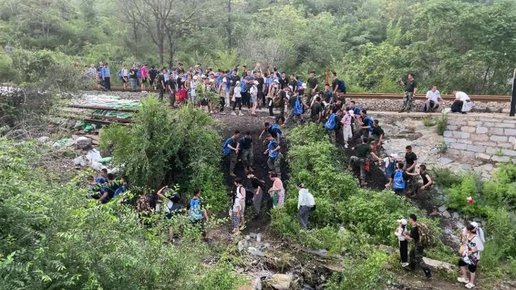 8月2日凌晨1时45分,第一批328名旅客开始向山下转移,328名乘客被分成20—30人的小组,沿着铁路线,途中经过多个山体隧道,脚下的路基覆盖着碎石、泥土和树枝,漆黑的隧道里水流成河,桥下的永定河水轰轰作响。在步行了7公里,终于在4个小时后,于拂晓前抵达斜河涧车站,并于早8时许乘坐接驳列车到达北京丰台站。
