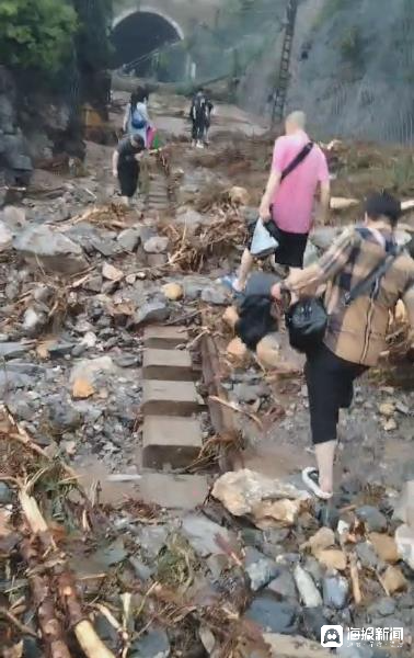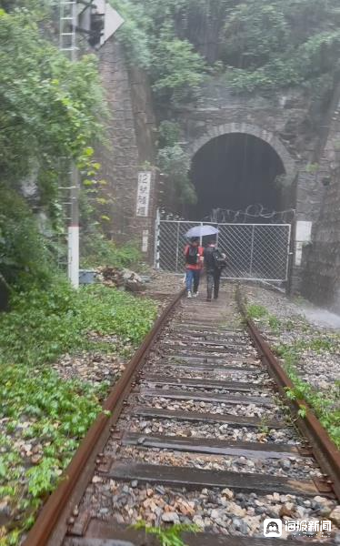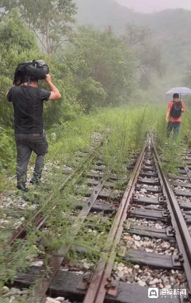 走出去的难度确实出乎了所有人的想象,沿途有的路段铁轨已经被淤泥覆盖,一不留神踩进去,雨鞋就留在了泥巴里。也有的路段路基被水冲毁,铁轨悬浮在半空中,十分危险。“路很难走,有的铁轨已经整个陷下去了,上面都是淤泥,工作人员告诉我们把鞋脱了往前走,要不然鞋陷进去可能就拔不出来了。后来我们脱鞋往前走,有各种奇怪的小石头,脚特别疼。还有一段路坍塌了,人走不过去,我们就只能顺着旁边的一个杆爬过去。”