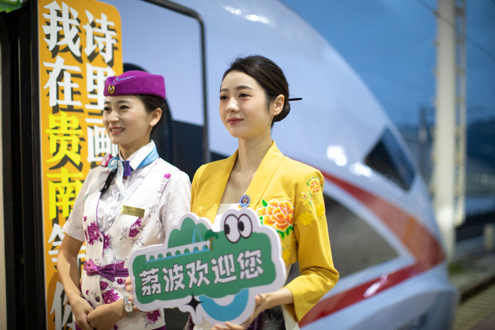 8月8日,身着少数民族服装的D6171次列车乘务员在贵阳北站迎接旅客。新华社记者刘续摄