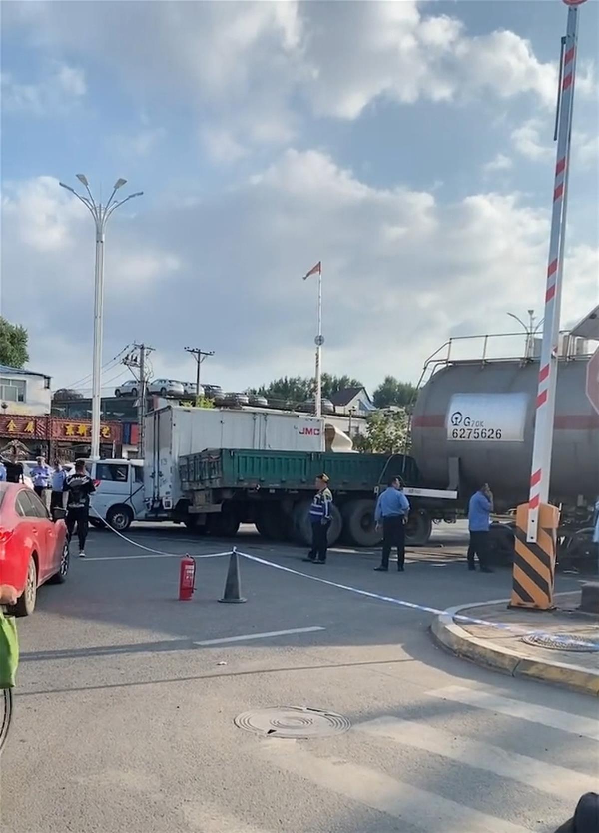 视频显示,现场拉起了警戒线,火车的车尾与一辆大货车相撞,火车运送的罐体上标有“轻油易燃”字样,其中一节列车还因碰撞脱轨。
