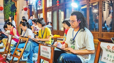 夏日夜晚,学生在川汇区关帝老街内集体写生。