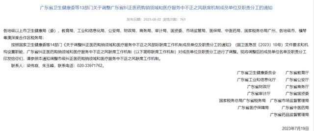 8月2日,广东省卫健委官网发布《关于调整广东省纠正医药购销领域和医疗服务中不正之风联席机制成员单位及职责分工》的通知称,调整广东省纠正医药购销领域和医疗服务中不正之风联席工作机制。