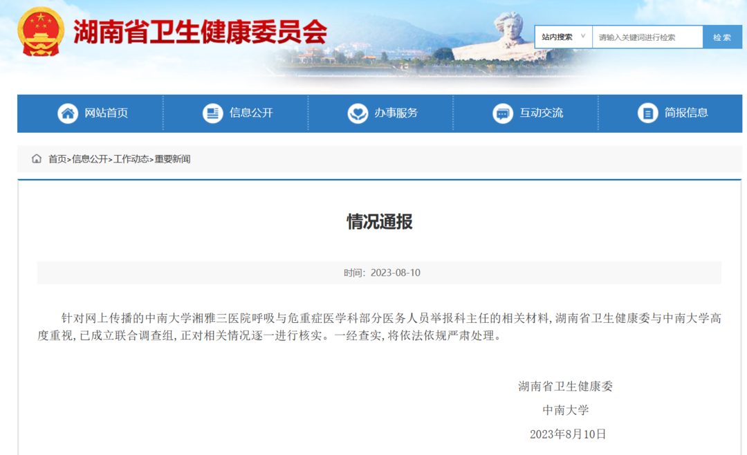 10日,湖南卫生健康委、中南大学发布情况通告:针对网上传播的中南大学湘雅三医院呼吸与危重症医学科部分医务人员举报科主任的相关材料,湖南卫生健康委与中南大学高度重视,已成立联合调查组,正对相关情况逐一进行核实。一经查实,将依法依规严肃处理。