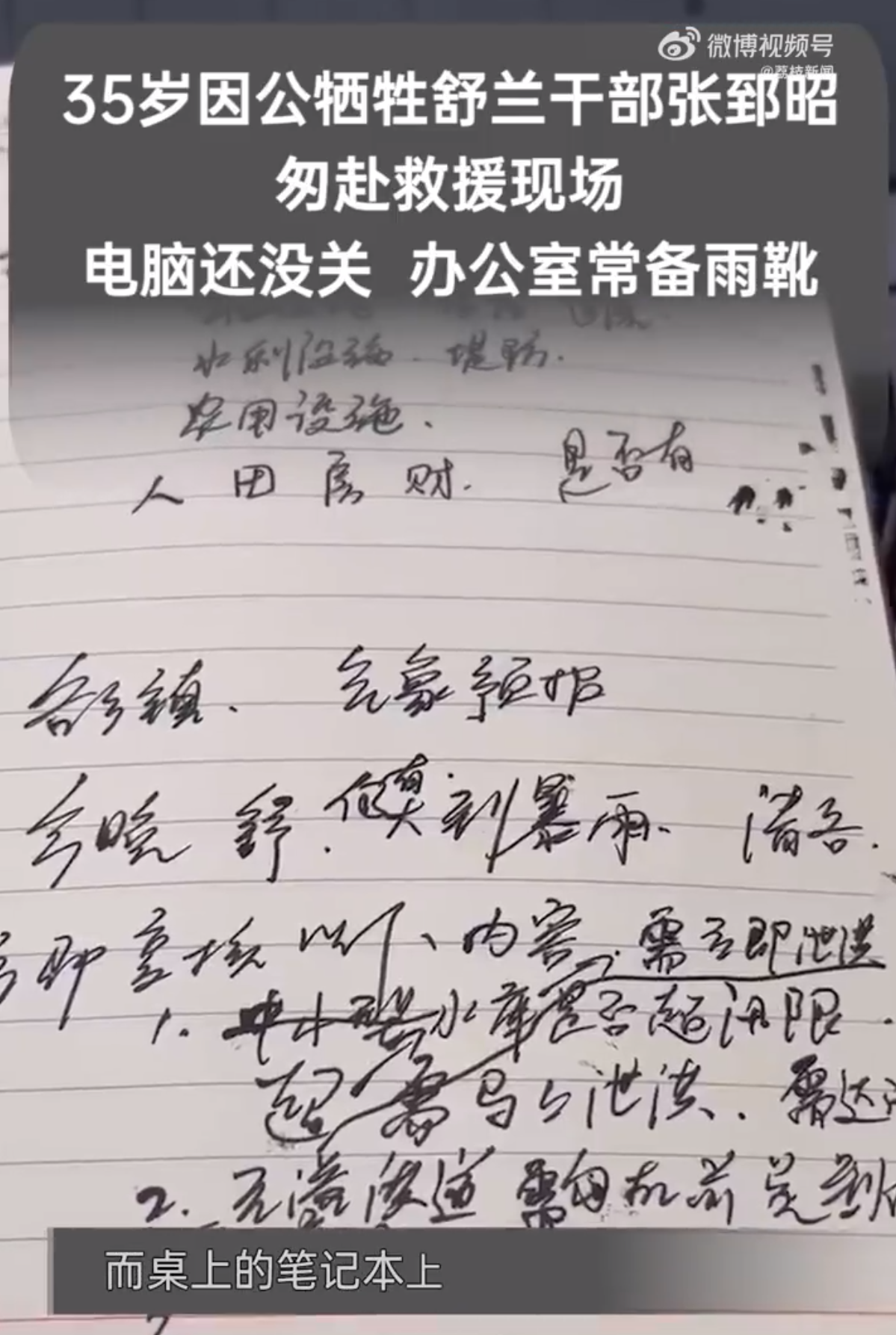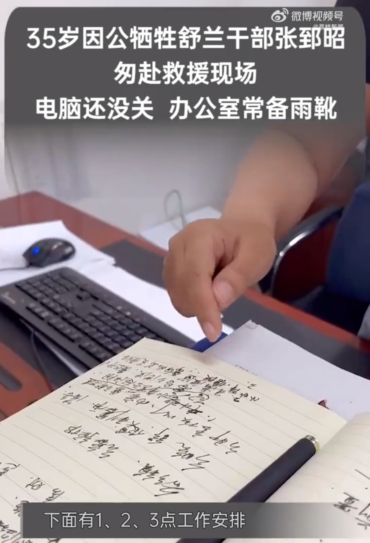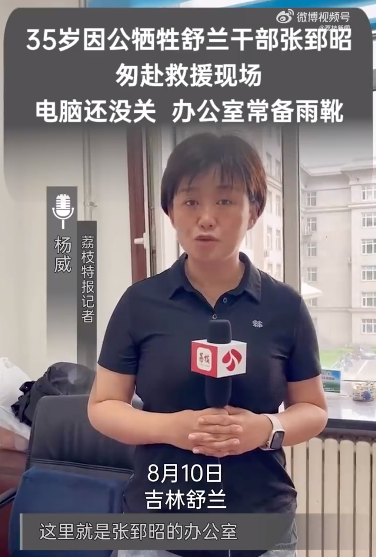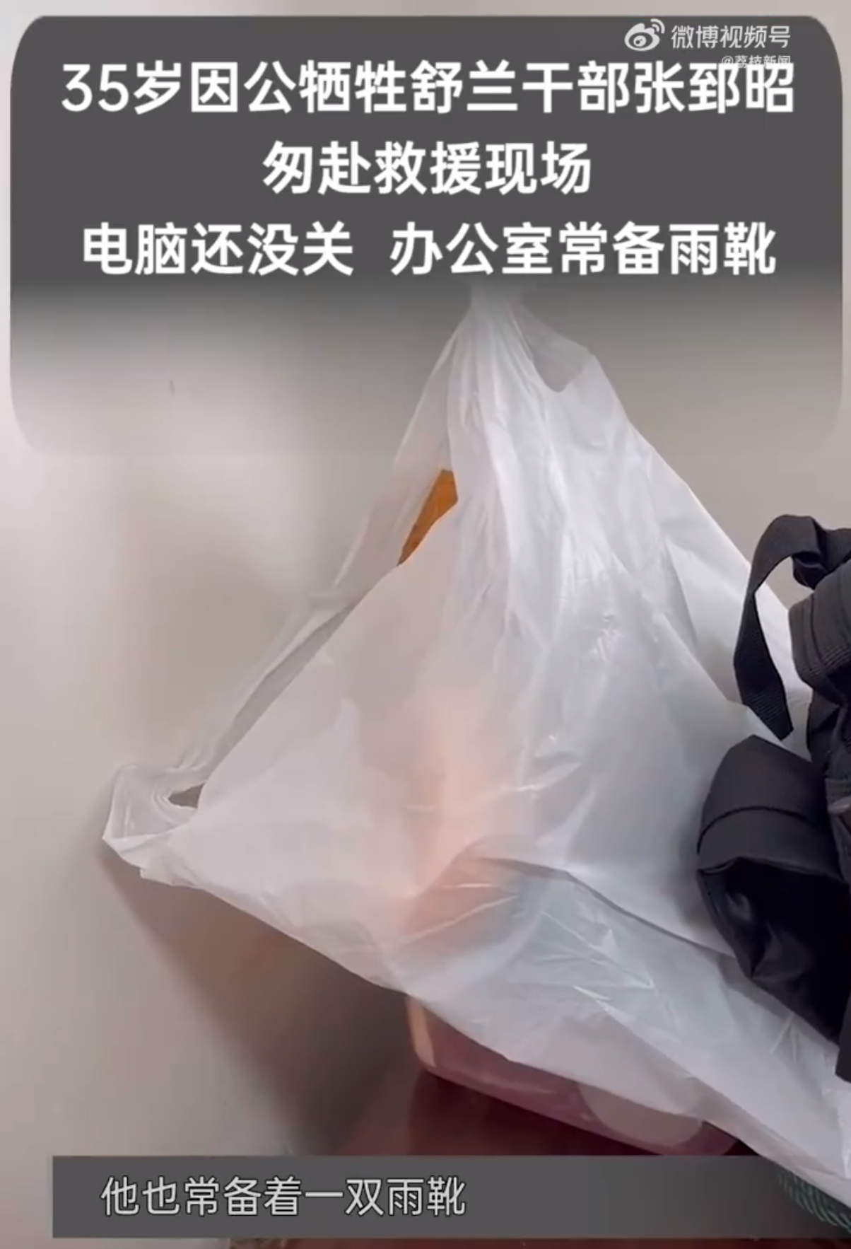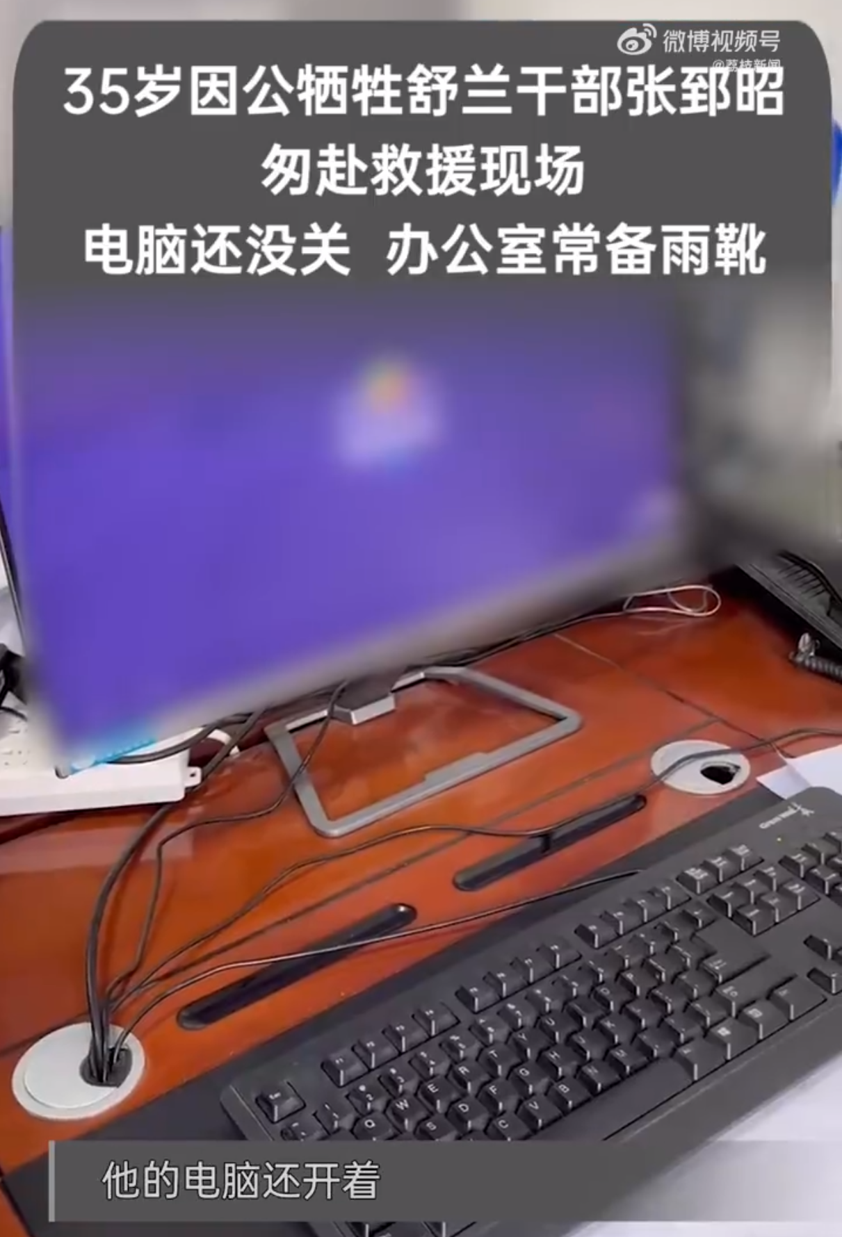 8月10日,据荔枝新闻消息:记者在因公牺牲的舒兰干部张郅昭的办公室看到,由于匆忙赶赴救援现场,他的电脑还没来得及关上,因为经常下乡,他在办公室常备着一双雨靴。