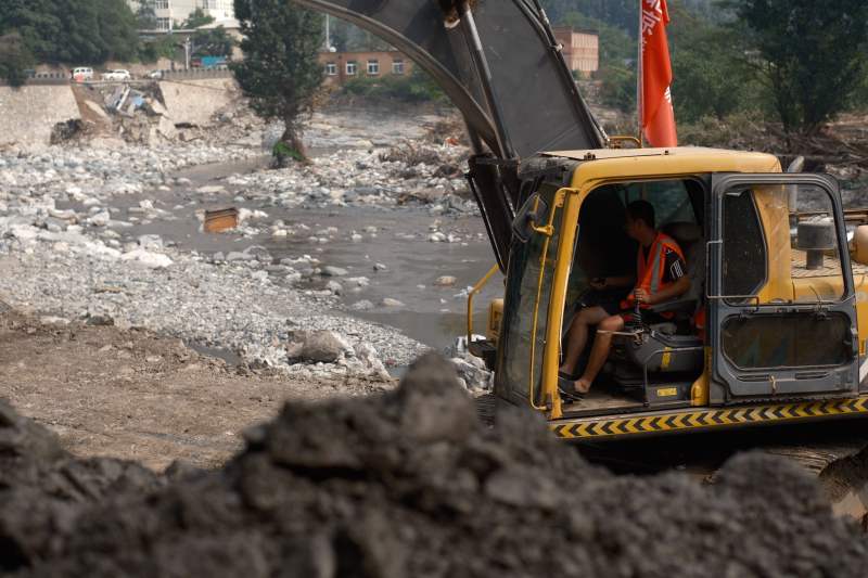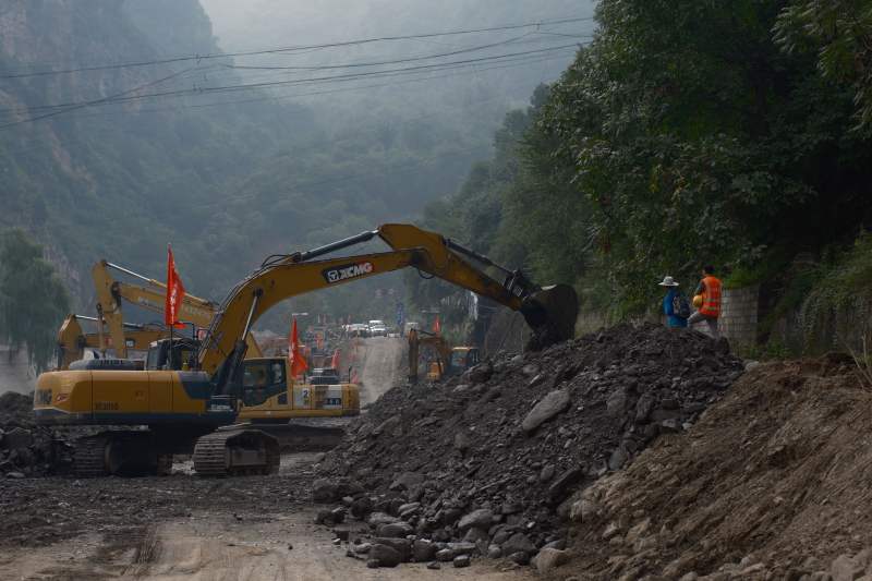 8月10日,108国道接近霞云岭乡附近,师傅操控着挖掘机,填平道路。新京报记者曹晶瑞摄