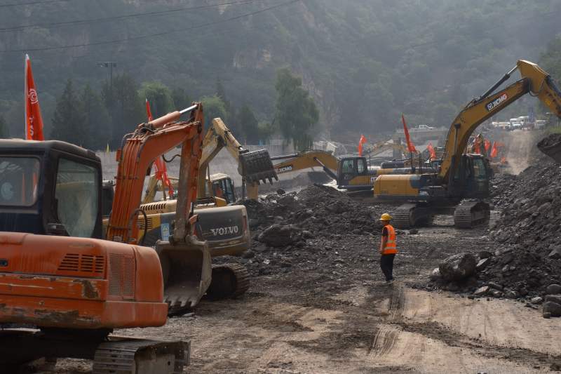 8月10日,108国道附近,几十台挖掘机同时作业,把道路填平加固。新京报记者曹晶瑞摄