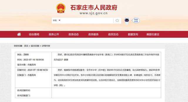 新黄河记者注意到,石家庄市人民政府网站曾在2023年7月回复市民留言,2023年秋季学期全市中小学9月1日开学。各中小学校不得以任何借口在假期组织学生集体到校上课、补课或统一组织自习,不得参与、动员和组织学生参加各类学科类辅导培训班。