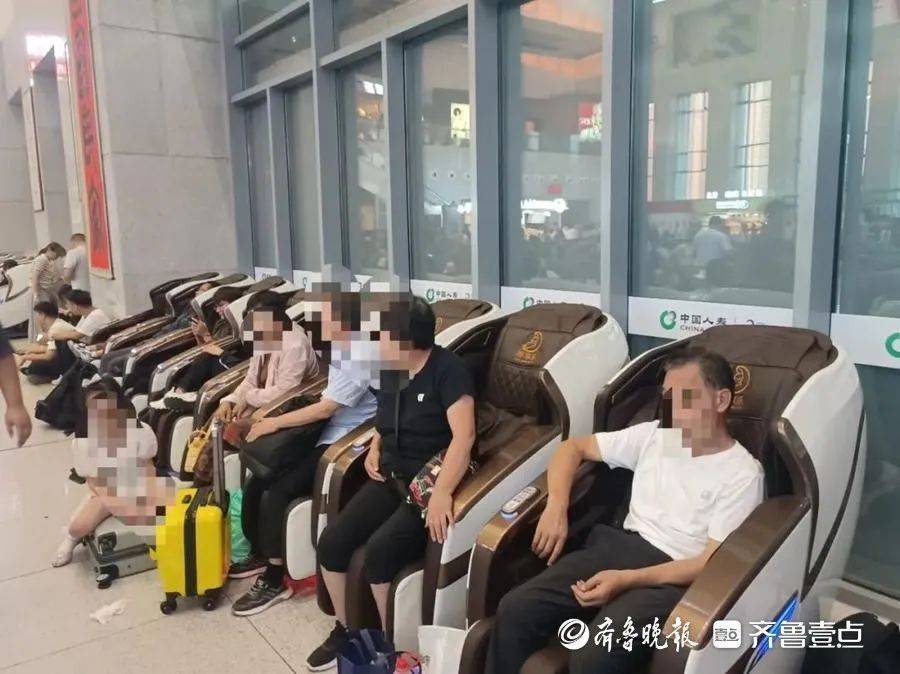 8月10日傍晚6点,记者实探泰安高铁站发现,候车厅里的按摩椅上几乎坐满了人,还有不少旅客在候车厅席地而坐。