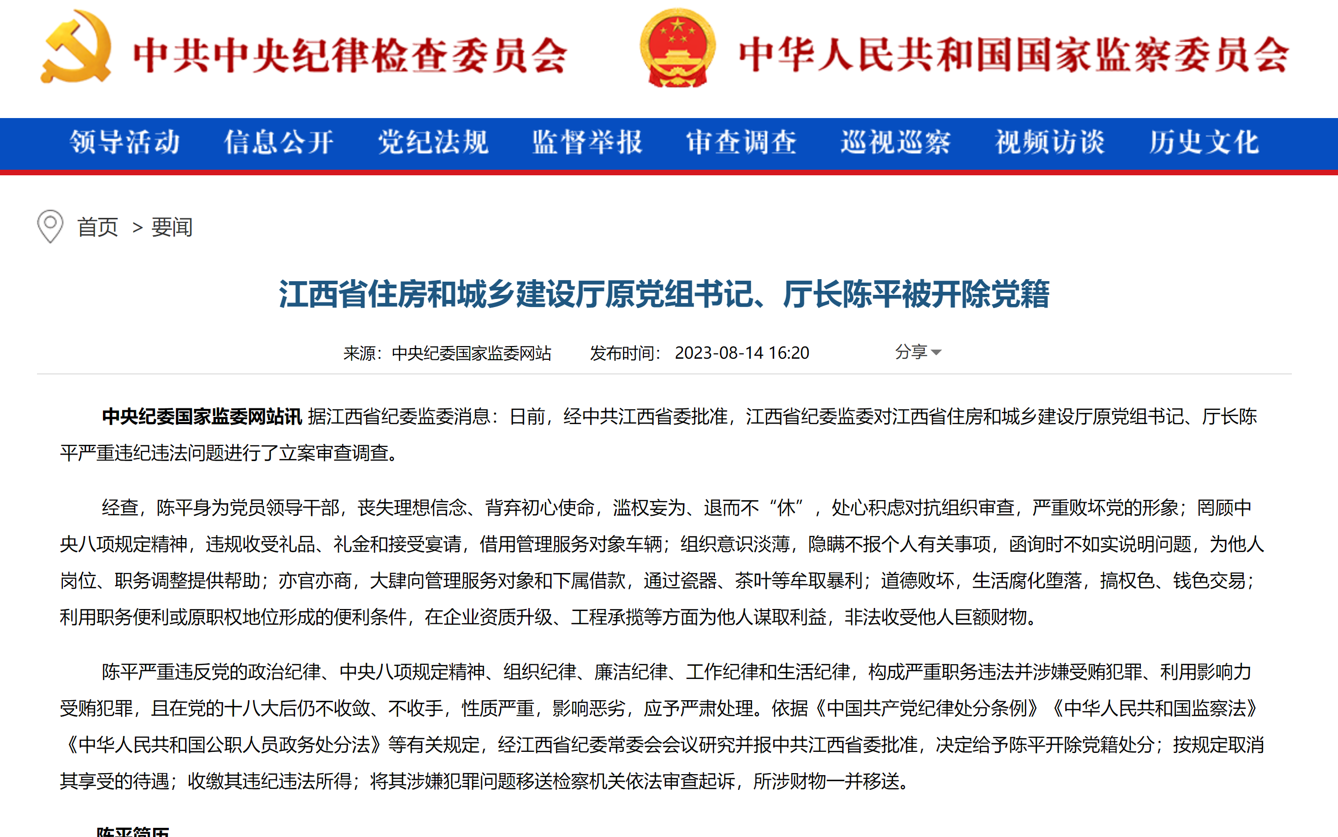 8月14日,据江西省纪委监委消息:日前,经中共江西省委批准,江西省纪委监委对江西省住房和城乡建设厅原党组书记、厅长陈平严重违纪违法问题进行了立案审查调查。