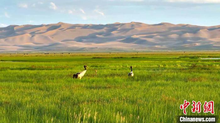空中俯瞰阿尔金山国家级自然保护区,芳草萋萋的依协克帕提湿地上,优雅灵动的黑颈鹤夫妇正在教授新出生的黑颈鹤宝宝学习捕食的技巧;鹤群的不远处,藏原羚一边享受着多汁的青草,一边好奇地打量着周围的环境。