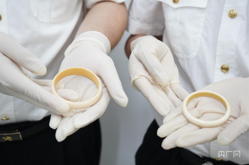 据介绍,日前,九洲海关关员在九洲港口岸旅检现场,分别从1名进境和1名出境旅客随身携带的物品中,各查获疑似象牙手镯1个。8月8日,经拱北海关技术中心鉴定,确认上述手镯均为非洲象象牙制品,非洲象属于《濒危野生动植物种国际贸易公约》(CITES)附录Ⅰ(2023年版)列明的濒危物种。