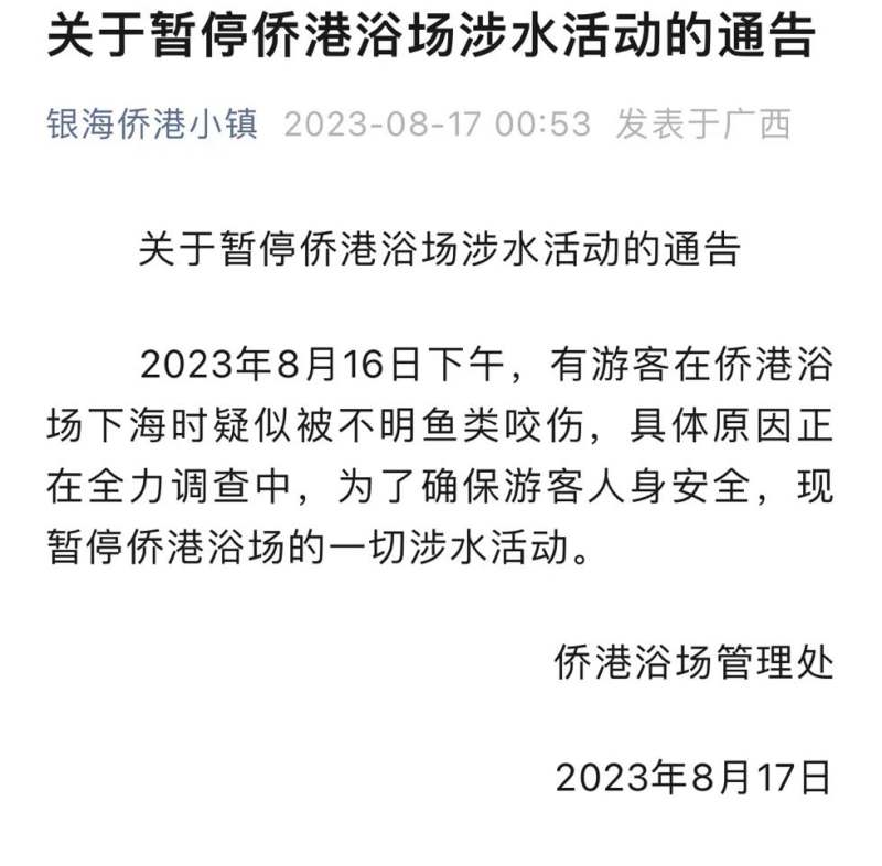 新京报讯(记者丛之翔熊丽欣实习生王浩霖)8月16日下午,广西北海侨港浴场,有游客在下海时疑似被不明鱼类咬伤。事发后,侨港浴场的一切涉水活动暂停。17日13时许,侨港镇镇长郑道富告诉新京报记者,相关部门仍在对不明鱼类进行排查,通过放渔网的方式,在侨港浴场附近海域开展工作。