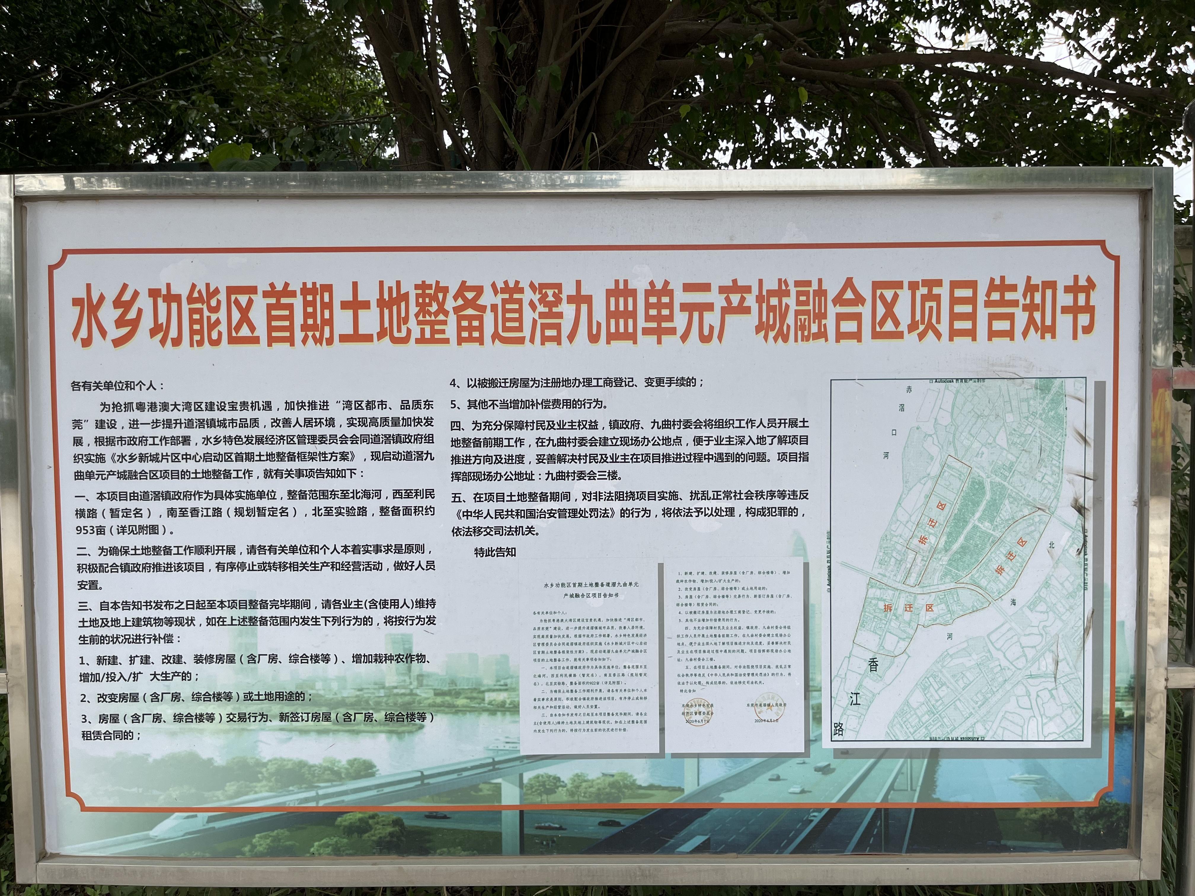 告示牌还附着一份由东莞水乡特色发展经济区管委会与道滘镇政府共同作出的《水乡功能区首期土地整备道滘九曲单元产城融合区项目告知书》(下称《告知书》),落款时间为2020年6月1日。《告知书》显示,自本书发布之日起至本项目整备完毕期间,请各业主(含使用人)维持土地及地上建筑物等现状,如发生新建、扩建房屋,买卖或租赁房屋等行为,将按行为发生之前的状况进行补偿。