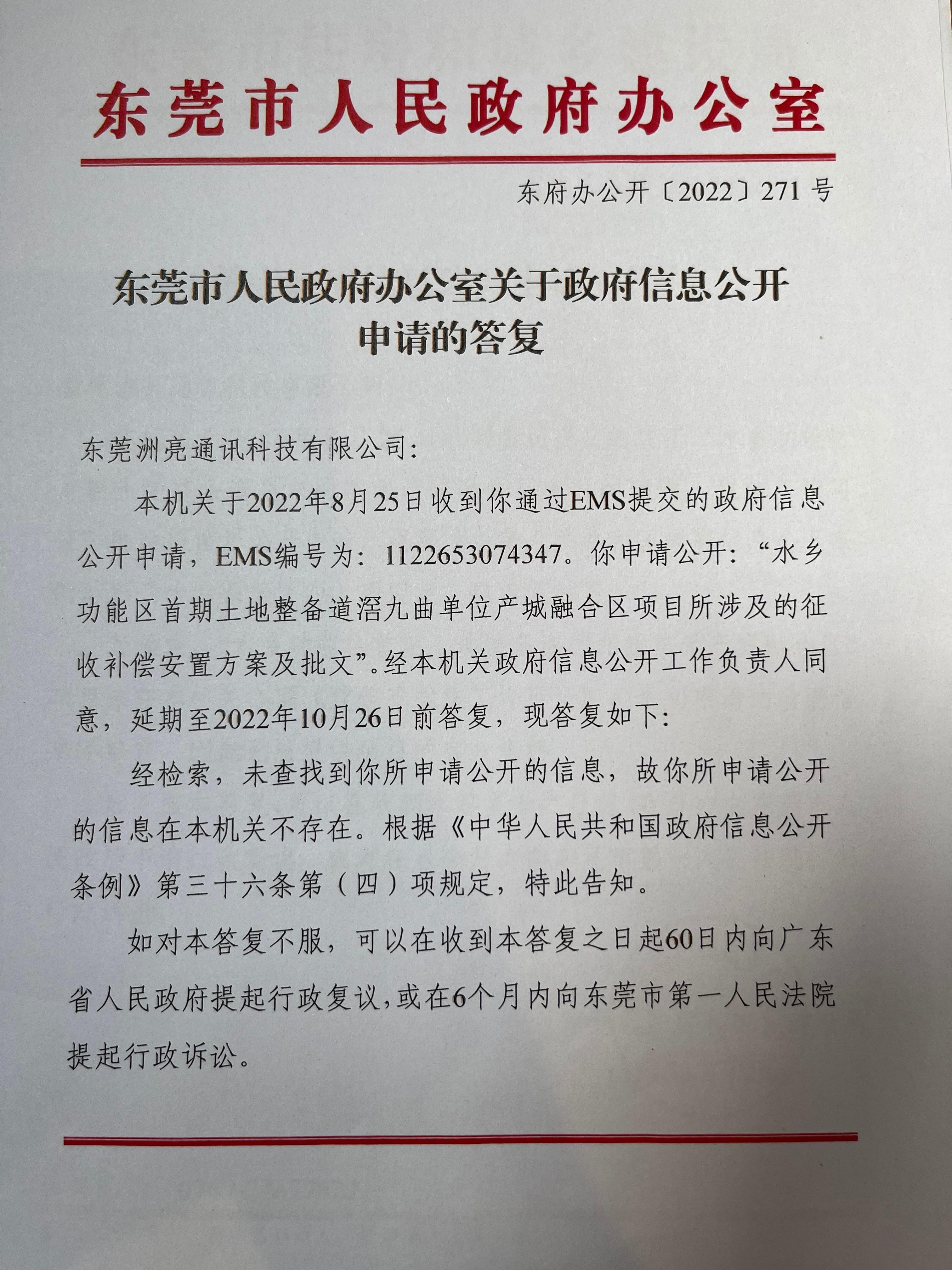于是,在李月亮的授权下,张贤良以洲亮公司的名义向东莞市政府及市自然资源局、市发改局、市住建局等职能部门申请公开九曲项目的征收补偿安置方案及批文、立项批准文件及报批手续等内容。2022年9月14日,东莞市发改局答复称“经检索,未查找到您单位所申请公开的信息,故您单位申请公开的信息在本机关不存在。”同月20日,东莞市自然资源局答复称:“经核查,上述信息我局不存在”。东莞市政府办公室则在延期一个月后作出答复:“经检索,未查找到你所申请公开的信息,故你所申请公开的信息在本机关不存在。”