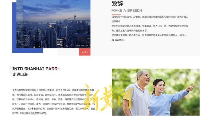 在山海集团的官网中,关于对企业的业务及使命均与老人有关:山海与您一同走过十几个春秋,集团在壮大但山海的初心始终未变:让天下老人快乐养老!我们要做世界第一的养老企业,努力不辜负每个关心和爱护山海的人,相约山海,天天精彩。然而,随着曾经许下“免费旅游”的承诺逐渐无法兑现以及警方的介入,“让天下老人快乐养老”的另一面浮出水面。