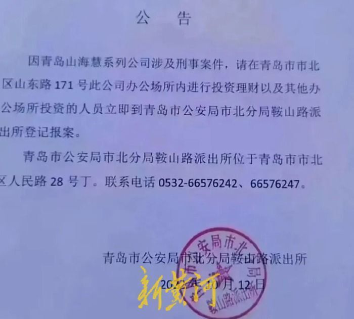 2021年8月26日,济南市历下区人民政府官网显示,泉城路街道召开打击和处置非法集资会议,经济发展服务中心工作人员按照前期摸排情况,详细介绍了辖区内疑似非法集资情况的重点领域及行为,并传达了区打击和处置非法集资工作领导小组办公室下发的《关于提示山海集团涉嫌非法集资风险的函》;2022年10月,青岛市公安局市北分局发布公告称:因青岛山海慧系列公司涉及刑事案件,请在青岛市市北区山东路171号此公司办公场所内进行投资理财以及其他办公场所投资的人员立即到青岛市公安局市北分局鞍山路派出所登记报案。