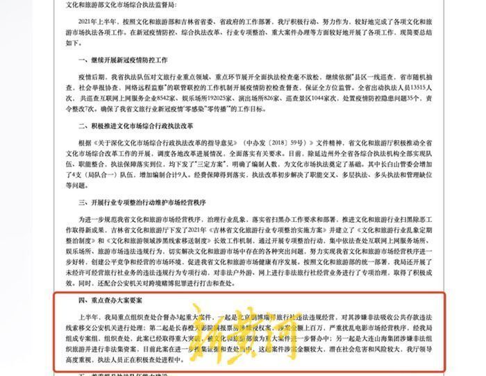 另据《家庭周报》2023年1月发布的文章中称,2021年7月7日,吉林省人民政府官网发布《2021年上半年文化市场综合行政执法工作总结》中第四项显示:“重点查办大案要案”中提到“大连山海集团涉嫌非法组织旅游并进行非法集资案,目前此案在进一步搜集证据和查处当中,这起案件涉案金额较大,潜在社会危害和风险较大,我厅领导高度重视,执法人员正在积极查处进程中。”