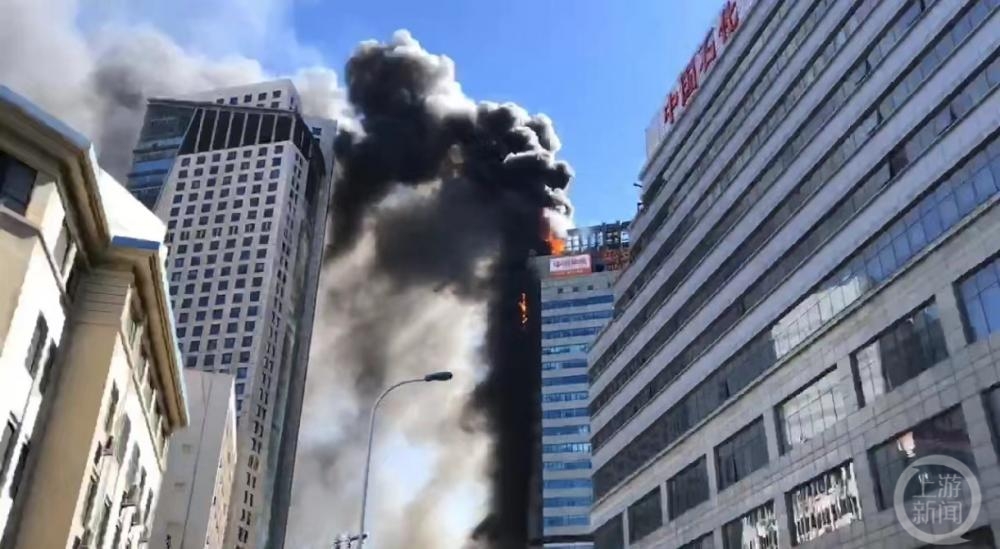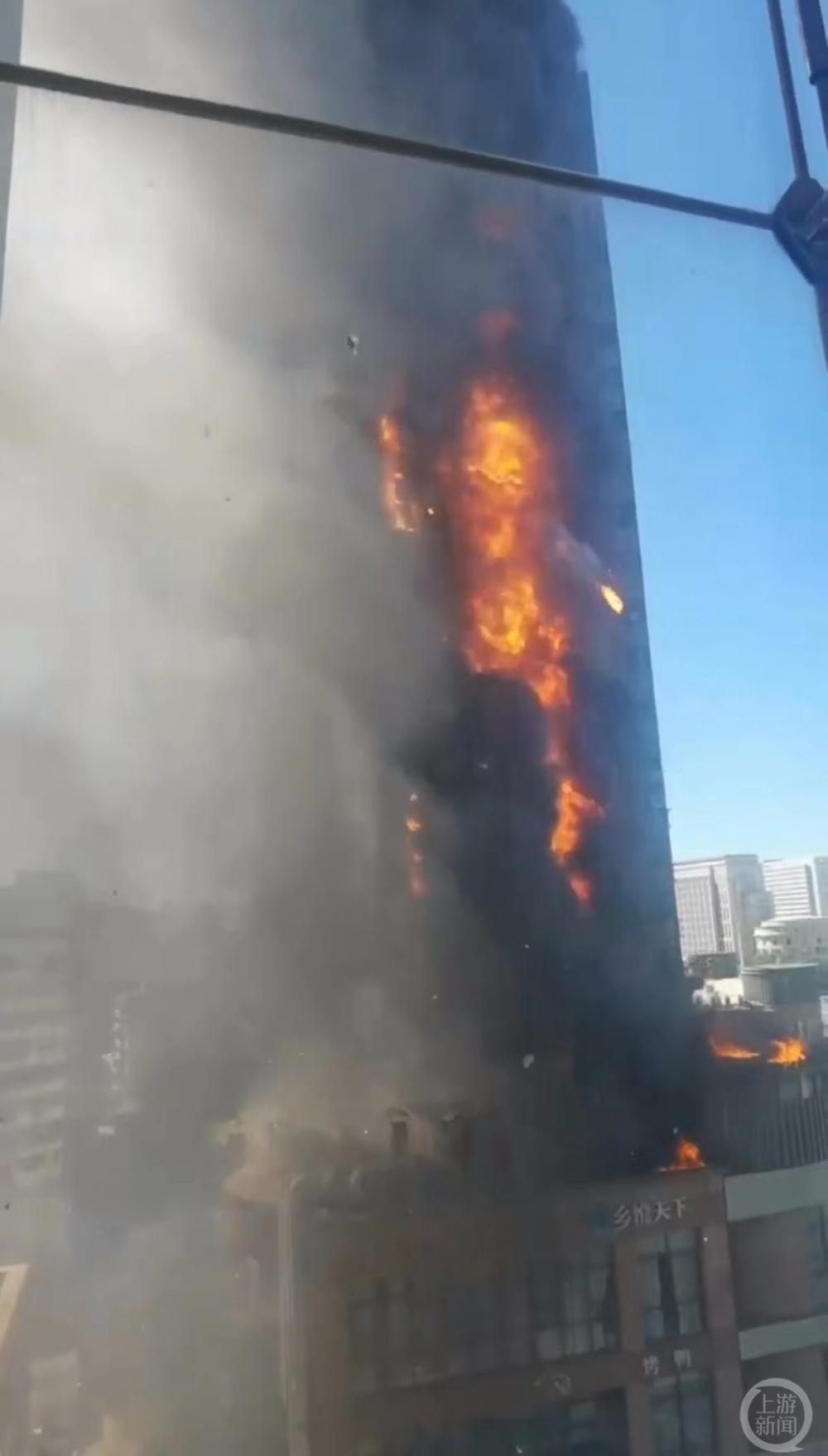 现场视频画面显示,数百米外可见浓烟和火光,位于新天地大厦3-4层的饭店乡悦天下免于火情,从该饭店往上燃起熊熊大火,整个楼体被火焰和黑烟覆盖,高层还有碎片掉落。