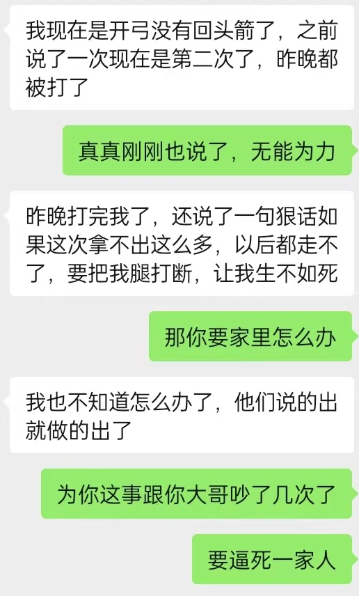 尹女士询问,今天有没有挨打。刘建回复,没有招到人就要被打10-20下。在聊天记录中,他几次说“坚持不下来了,想从9楼跳下去,就当没有我了。”