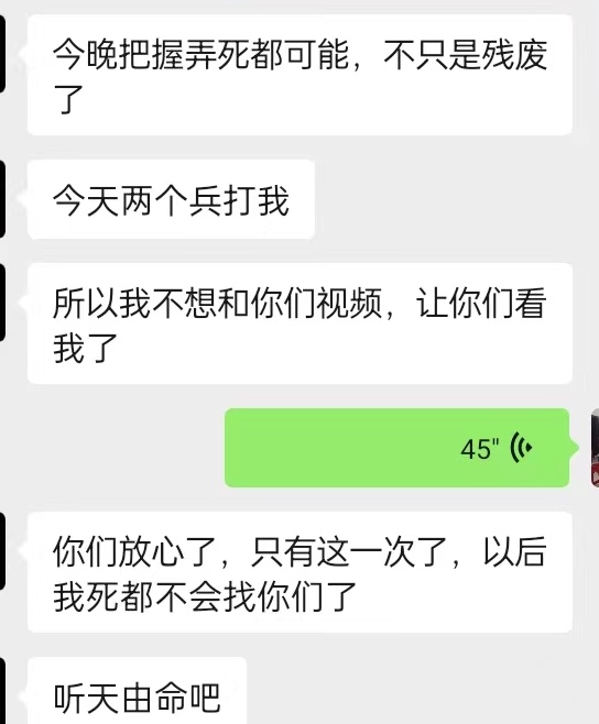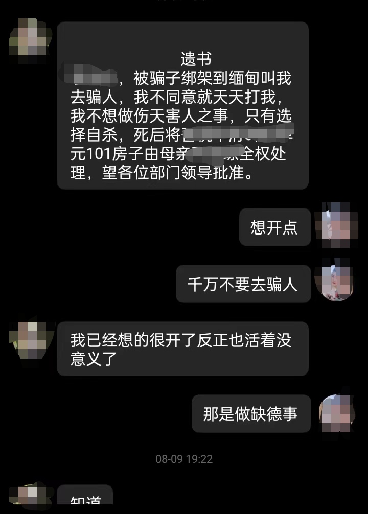 19日,有人通过社交平台向尹女士发来几张聊天截图,截图中的男子同样被困在缅甸。他与家人的聊天记录中称,与刘建在同一个宿舍,刘建几天前从9楼跳下死亡。“喊他忍住,他自己不听。他老妈还不知道他的情况。”