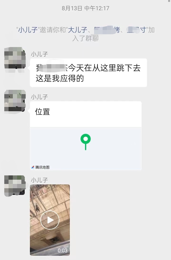 同时,他也在家里微信群留言:“我刘建今天从这里跳下去,这是我应得的。我心意已决,各位朋友家人来世再见。”