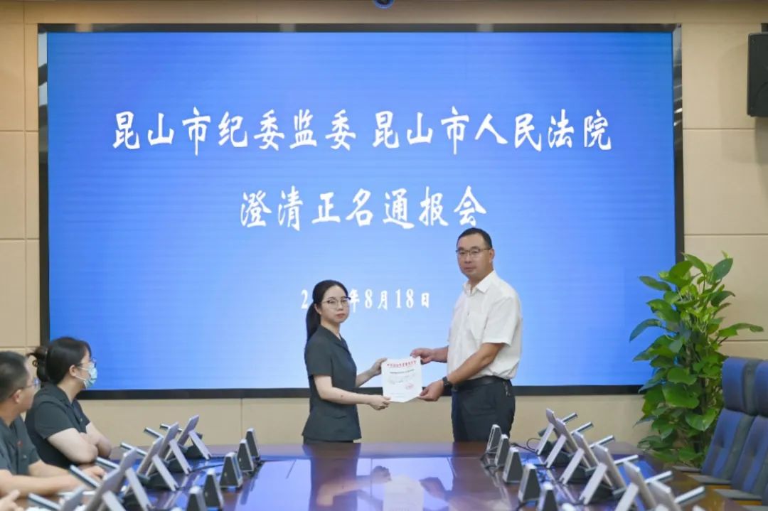 8月18日,江苏省昆山市纪委监委在昆山市人民法院召开澄清证明通报会,纪委派驻派驻政法委纪检监察组对昆山法院千灯人民法庭法官胡小娟的失实举报情况进行了公开澄清,并将澄清通报函递交给胡小娟。