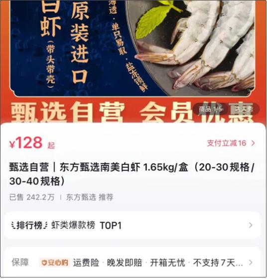 东方甄选方面对记者透露,自营南美白虾24日销量暴涨,截至当日17点,日销量已经突破2.5万单,远远高于日常的7000单销量。据悉,该虾已经售卖累计超过242万单,位列某音虾类爆款榜Top1。