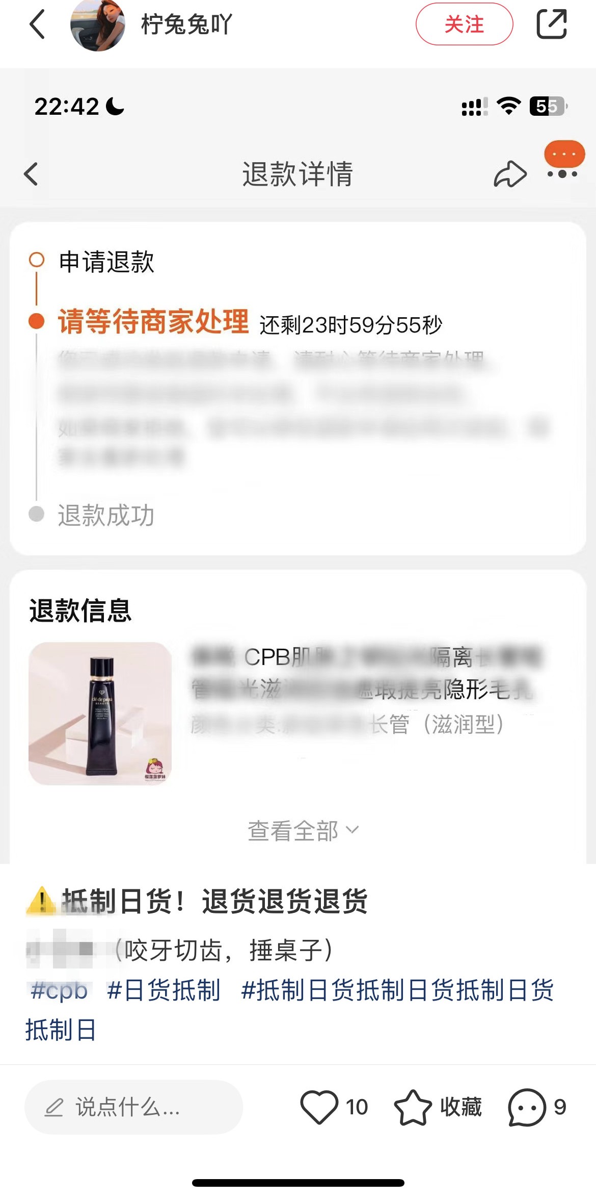 在社交平台上,8月24日晚就有网友晒出了退款截图。该网友在电商平台一家化妆品店内购买了一款CPB的隔离霜,从截图可以看到,该网友已退款成功。
